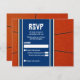 Tarjeta de respuesta de Bar Mitzvah con tema de baloncesto con fondo de baloncesto naranja. Esta tarjeta de respuesta de Bar Mitzvah de baloncesto es elegante y moderna. Esta tarjeta de respuesta de Bar Mitzvah con tema de baloncesto presenta un fondo de baloncesto naranja combinado con una camiseta de baloncesto azul para el fondo detrás del texto. Los colores de esta tarjeta de respuesta de Bar Mitzvah con tema de baloncesto son azul, naranja, blanco y negro.
