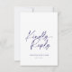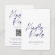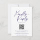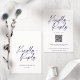 Esta elegante tarjeta de respuesta RSVP blanca presenta un diseño de caligrafía sofisticado y moderno con "Kindly Reply" en elegante letra cursiva azul marino. Un práctico código QR permite a los invitados responder fácilmente y seleccionar sus preferencias de comida en línea. Personalizada con los nombres de la pareja y la fecha de la boda, esta tarjeta de respuesta de invitación refinada es perfecta para temas de boda formales y atemporales. Una forma moderna y elegante de recopilar las respuestas de los invitados mientras se añade un toque de elegancia a la papelería de su boda.