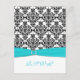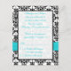 Esta tarjeta de respuesta de damasco en blanco y negro tiene una cinta impresa azul aqua y un broche de joya de diamante impreso que sería perfecto para una boda con tema aqua y negro. Algunos de los papeles alterarán el color del diseño, así que use con precaución si elige el papel de fieltro, ya que puede amarillear más de lo que desea. NO usaría los papeles metálicos dorados o plateados, ya que oscurecerán el diseño sin agregar ningún brillo adicional que lo que obtendría con los papeles metálicos de hielo o champán. ASIMISMO, si cambia el tamaño de la tarjeta, o si cambia las fuentes, o el tamaño de la fuente, parte del diseño y/o texto puede quedar cortado. Todo se imprimirá como se ve en su monitor. No veré su invitación, y Zazzle NO corregirá nada (errores tipográficos, desalineación, etc.). El texto y el papel son totalmente personalizables. ****POR FAVOR TOME NOTA de que este tamaño de tarjeta de respuesta (4,25”x5,5”) solo cabe en el sobre para la invitación de 5"x7". También hay una tarjeta de respuesta de tamaño más pequeño en este diseño si lo prefiere. Se puede encontrar en la página con la invitación cuadrada. Si necesita ayuda con esta invitación, por favor
