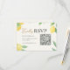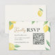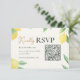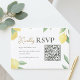 Tarjeta moderna de respuesta a bodas con limón que presenta cítricos en acuarela y follaje que enmarcan un diseño limpio con “Se ruega responder” y un gran código QR para facilitar las respuestas en línea. Los invitados pueden escanear el código o visitar el sitio web de la boda impresa, lo que hace que esta tarjeta sea perfecta para parejas que utilizan respuestas digitales para bodas con temas cítricos, de jardín, italianas o de verano. Un dorso minimalista con un solo limón añade un toque de refinamiento y deja espacio para notas manuscritas opcionales.