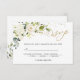Este diseño presenta un ilustracion de rosas blancas con un follaje colorido y vibrante al estilo acuarela. El texto "rsvp" está escrito en un guión.