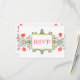 Una plantilla de tarjeta de respuesta de vacaciones personalizada con letras de escritura personalizadas en rojo y una elegante marca de impresora vintage con un escudo decorado y un diseño floral de margaritas y hojas rizadas en rojo y dorado, restaurado de un manuscrito antiguo.