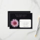 Esta magnífica tarjeta RSVP de retorno para bodas incluye una flor gigante de margarita rosa y blanca de gerbera sobre un impresionante fondo negro, lo que hace que una tarjeta de retorno de RSVP floral verdaderamente única y encantadora para su boda. Copyright henishouseofpaper