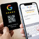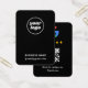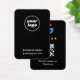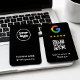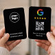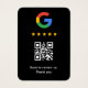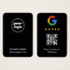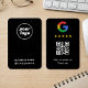 Este diseño elegante presenta un fondo negro atrevido con tipografía blanca limpia, un área de logotipo circular y una distribución moderna centrada en reseñas. El estilo frontal y posterior incluye un código QR prominente, cinco estrellas doradas y un gráfico de reseñas colorido inspirado en Google para un aspecto pulido y profesional. Su estética minimalista lo hace especialmente atractivo para pequeñas empresas, salones, cafeterías y marcas de servicios que desean una identidad visual nítida y moderna. La distribución simple mantiene el enfoque en el reconocimiento de la marca y la fácil interacción con los clientes.