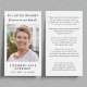 Simple y elegante tarjeta de oración para el funeral y el funeral de un ser querido. El frente presenta "In Loving Memory of" y "eternamente in our heart" en una mezcla de tipografía y escritura. Personaliza con su foto, nombre, fecha de nacimiento y muerte. En el reverso aparece un largo pasaje inspirador ("No llene sus corazones con dolor") y un mensaje más corto, o un personalizar con sus propios mensajes o versos bíblicos.