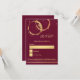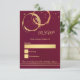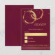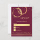 Tarjeta de RSVP elegante con manchas de vino que se cruzan en oro y oro rosa con confeti sobre un fondo borgoña. La parte delantera tiene una imagen de fondo de texto separada para que sea más fácil para sus invitados escribir. Puede arrastrar o eliminar esta imagen según sus necesidades.