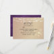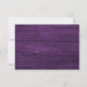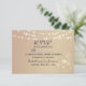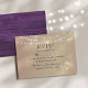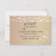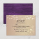 Tarjeta de RSVP de boda rústica y elegante con rosado oro y madera violeta, luces de cadena, encaje floral dorado y letra caligráfica sencilla.