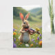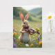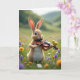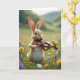Este diseño muestra un conejo erguido y esponjoso con pelaje de color cervato que se encuentra en una pradera verde, sosteniendo un pequeño instrumento de cuerda como si estuviera a punto de tocar una melodía suave 🐰. Un pequeño pájaro amarillo se posa cerca en la parte superior rizada del instrumento, inclinándose con una inclinación atenta que se siente como un vínculo dulce y confiado entre los dos. La luz suave baña sus rostros, captando los ojos anchos y curiosos del conejo y dando a la escena un ambiente tierno y de camaradería. Alrededor de ellos, flores silvestres dispersas en lavanda, amarillo soleado y blanco puntean el césped como pequeñas señales de afecto 🌷. El fondo se desvanece en colinas verdes onduladas y un cielo pálido, con una apariencia borrosa y soñadora que mantiene el enfoque en la pareja. Cerca de la parte superior, el texto de saludo se sienta centrado en un tono pastel claro, y una línea más pequeña de texto descansa debajo en un tono ligeramente más oscuro