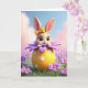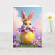 Diseñada con un conejito estilizado y dulce que se asoma desde un huevo decorado de gran tamaño, esta tarjeta se centra en grandes ojos oscuros brillantes y una pequeña sonrisa hacia arriba que se siente como un tímido saludo 🐰. Una cinta amarilla brillante se sienta en su cabeza, y las mejillas sonadas calientan su suave pelaje de tono melocotón. El conejito se inclina hacia adelante como si compartiera un momento privado con el espectador, agregando una cercanía suave y amigable a la escena. Alrededor de él, pétalos morados en capas forman una especie de cápsula en forma de flor, que se abre como un ramo alrededor del personaje 🌷. Debajo, una forma de huevo de color amarillo soleado está salpicada de pequeños lunares blancos y descansa sobre un parche ordenado de hierba verde rica. Cualquier texto de saludo se sienta cerca de la parte superior en un