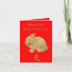 Hermosa tarjeta de felicitación china de Año Nuevo hecha en rojo brillante, con gráficos de un conejo dorado y el símbolo para conejo debajo. Los saludos de Año Nuevo en mandarín y cantonés se hacen en oro, en la parte superior de la carta. El personaje Fu o Fook que significa fortuna o suerte se muestra tradicionalmente boca abajo en las tarjetas de Año Nuevo mientras se hace el símbolo dentro de la tarjeta.