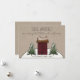 Tarjeta de saludo de Casa Rústica Campestre - Esta adorable tarjeta de Navidad campestre presenta una casa de estilo saltbox roja (burgundy) con árboles de hoja perenne a cada lado en una colina de nieve. La tarjeta está sobre un fondo Kraft. La tarjeta también presenta un saludo de Navidad en la parte posterior de la tarjeta. La tarjeta está personalizada con su nombre. La tarjeta es parte de una colección.