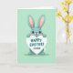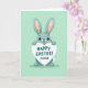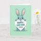 Esta tarjeta presenta a un personaje de conejo amistoso de orejas largas con ojos grandes y expresivos y pelaje suave de color teal, de pie centrado en un fondo verde menta pastel 🐰. El conejo levanta una señal en forma de corazón sobre su cabeza como si se la ofreciera a alguien especial, con una sonrisa tierna y ansiosa y mejillas sonrosadas que sugieren un enamoramiento dulce o una amistad cercana. El texto de felicitación se encuentra en la señal del corazón en letras teal profundas, con un par de pequeños símbolos de afecto colocados cerca. Un tinte rosa suave perfila las orejas internas altas, enmarcando la cara y agregando una apariencia suave y afectuosa. El diseño se mantiene simple con mucho espacio abierto, manteniendo el enfoque en el personaje y el mensaje. Los colores se sienten ligeros y primaverales 🌷, con contornos suaves y un entorno tranquilo y despejado
