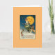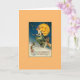 Tarjeta de saludo de Halloween de época Vintage / Victorian. ¡Encantadora bruja montando su escoba frente a una luna sonriente! ¡Todo Hallowe'en! Cuando el mundo está envuelto en madera, y la luna está navegando alto, si te metes entre las cortinas, verás brujas paseando.