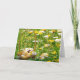 Carta de bienvenida de Pascua feliz con una canasta de huevos de Pascua dorados en una hierba verde llena de hermosos dientes de león amarillos y margaritas blancas.