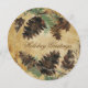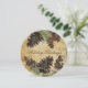 Una hermosa tarjeta de vacaciones de Navidades para mandar a todos tus amigos y familiares, incluye una tarjeta redonda con un fondo de textura marrón, conos de pino, ramas de árbol y texto de personalizable que lee los saludos de feriado en la parte delantera, el mismo fondo de textura marrón, conos de pino y ramas con un área de personalizable para agregar tu nombre familiar, nombres y el año actual en la parte posterior.