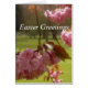 Tarjeta de saludos de Pascua con flores de árbol rosado. Hermoso acercamiento de la flor de los árboles rosados en primavera para dar la bienvenida a Pascua en esta tarjeta de saludos. Los frondosos árboles y las zonas verdes forman el telón de fondo de esta bonita fotografía natural de una hermosa flor rosa. Las palabras dicen "Saludos de Pascua" en la parte delantera de la tarjeta. Hay mucho espacio para tu propio mensaje personal dentro. (Personalizable)