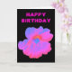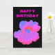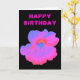 Esta tarjeta de felicitación luminosa incluye una fotografía de una flor de Nasturtium. La foto ha sido pintada artificialmente, lo que ha resultado en una flor rosa brillante con algunos tonos azules mezclados. El fondo negro ofrece un agradable contraste. Hay un texto rosa personalizable encima de la flor, en el exterior de la tarjeta, que dice "Feliz cumpleaños" pero que se puede cambiar para que se adapte a otras ocasiones. El interior de la tarjeta está en blanco.