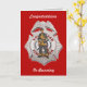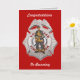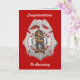 Esta tarjeta roja de motor de fuego está decorada en el frente con un bombero de juguetes superpuesto a la insignia de un bombero voluntario. El saludo interno se puede personalizar.