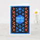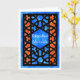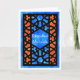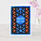 Una tarjeta de felicitación Ramadán con un patrón tradicional de Entramado Islámico en negro sobre un fondo azul y naranja. El texto en el panel central está en blanco y dice 'Ramadhan Mubarak'. Diseño pintado a mano en acuarelas por Judy Adamson. El interior se deja en blanco para tu propio mensaje.