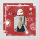 Un muñeco de nieve feliz con la nariz de zanahoria y la bufanda de rayas rojas, muchos copos de nieve en un fondo rojo festivo, un área en la que puedes agregar una foto, y áreas para agregar tu mensaje personal de vacaciones y nombre en tarjetas de felicitación de Snowman de vacaciones a todos tus amigos seguro que les encanta!