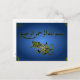 Una hermosa postal azul con una flor verde ornamental y una gran caligrafía árabe al estilo thuluth de Bismillah Al-Rahman Al-Rahim sobre un fondo de papel azul.