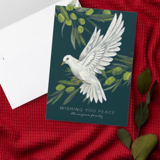 La tarjeta de vacaciones perfecta para enviar deseos de paz esta temporada de Navidades cuenta con una paloma blanca ilustrada a mano y ramas de olivo con un texto simple y elegante que es fácil de personalizar. No se olvide de hacer el reverso propio personalizando la foto y el texto para una tarjeta de vacaciones no confesional verdaderamente única, ideal para oficinas corporativas y organizaciones sin fines de lucro.