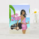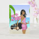 Tarjeta de San Valentín Afroamericana con mujer parada junto a un coche clásico en la playa