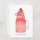 Ilustración de un batido de San Valentín inspirado en pastel de terciopelo rojo en un frasco de mason adornado con corazones, sprinkles, crema batida, jarabe y fresa. El texto dice, "Te amo mucho lácteo". La parte trasera presenta un patrón de batido de San Valentín.