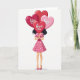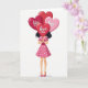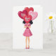 Esta tarjeta de felicitación muestra a una mujer parada debajo de un ramo de globos brillantes en forma de corazón que cubren la mayor parte de su rostro. Los globos llenan la parte superior de la tarjeta en rojos y rosas, y parecen flotar hacia arriba en cuerdas delgadas. Cada globo tiene texto simple, incluyendo "bésame", "te amo" y "abrázame", impreso en letras fáciles de leer justo en el centro de los corazones. El corazón rojo intenso más grande se encuentra en el medio y dice "te amo", y bloquea su rostro para que el mensaje sea lo más destacado. Debajo de los globos, ella usa un vestido rosa sonrosado con pequeños lunares blancos, una cinta rosa más oscura en la cintura y tacones puntiagudos a juego. Un poco de su cabello oscuro se asoma detrás de los globos, y el fondo es blanco liso para que los corazones y los mensajes sean el foco