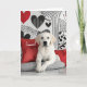Tarjeta de San Valentín de Labrador Amarillo. Curiosamente canino frente a un fondo contemporáneo en rojo, negro y blanco. No hay flores, solo corazones y bolsas de cortesía. El interior se deja en blanco para tu propio mensaje. El texto en la parte delantera es editable, al igual que el texto y el logotipo en la parte posterior de la tarjeta.