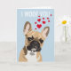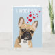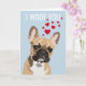 Tarjeta del día de San Valentín divertida de un perro con un fondo azul pastel que se puede cambiar a cualquier color, un lindo bulldog francés cervatillo, corazones rojos de amor y las palabras divertidas "Te QUIERO aullar".