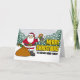 Una tarjeta de Navidad con un Santa feliz que sostiene un bolso de regalos y de una pequeña muñeca.