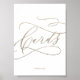 Esta señal de mesa de tarjetas de caligrafía dorada romántica es perfecta para una boda simple o una despedida de soltera. El diseño clásico moderno presenta giros elegantes y florituras caprichosas con tipografía de lámina dorada de champán falsa elegantemente escrita a mano. La línea de texto en la parte inferior de la señal se puede personalizar con la fecha, los nombres de la novia y el novio, o un mensaje corto como "Gracias". Esta señal se puede utilizar para una boda o cualquier evento o fiesta.