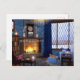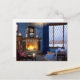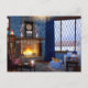 Un rincón acogedor para leer en un día nevado de invierno, con un gato jengibre sentado mirando el fuego ardiente. Alrededor de la chimenea hay sillones mullidos, con velas encendidas y pilas de libros y una taza humeante para completar la comodidad. Fuera, un sauce cubierto de escarcha y un seto de haya están oscurecidos por la nieve que cae.