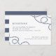 Elegante tarjeta de sobre de recepción de boda costera que presenta los detalles de su recepción en azul marino clásico sobre un fondo blanco crujiente, acentuado en las esquinas con lazos de cuerda náutica trenzada. Las tarjetas se invierten a franjas náuticas anchas.