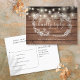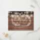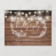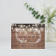 Una tarjeta de respuesta rústica con bonitas luces de cuerda, guirnalda floral dibujada a mano y tipografía elegante sobre un fondo de paneles de madera. El reverso incluye sus datos y una divertida solicitud de canción para invitados. Diseñado por Thisisnotme