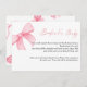Una encantadora tarjeta de solicitud de libro para baby shower con lazo rosa boho. Se pide a los visitantes que traigan un libro infantil nuevo o usado en lugar de una tarjeta.
