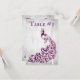 Mesas de recepción con una tarjeta de recepción Magenta Peacock Leaf Vine Wedding. El diseño de la tarjeta de mesa presenta un fondo gris claro con un pavo real magenta vibrante con un embellecimiento de vid de hoja. También hay material de boda adicional disponible con este diseño.