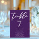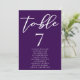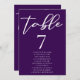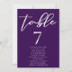 Este número real de la mesa boda morada incluye una hermosa tipografía blanca de los nombres de sus invitados en una sólida tarjeta violeta profunda para una ceremonia nocturna en invierno. Un guión minimalista y un color atrevido hacen que la decoración de la recepción sea pop y se destaque de la multitud.