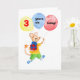 Una tarjeta de cumpleaños para un niño de 3 años con un ratón descarado pintado a mano, sosteniendo un regalo y globos con las palabras '3 años de edad hoy! El texto interno es 'Feliz cumpleaños'.