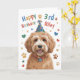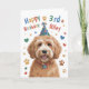 Esta linda tarjeta de cumpleaños de perro de tres años incluye un lindo perro Goldendoodle en una imagen gorra de cumpleaños. En la parte delantera, puede personalizar agregando el nombre de la persona que recibe esta tarjeta de cumpleaños. Puedes cambiar el año si quieres (por ejemplo, en lugar de "3er" cumpleaños podría decir "2do" cumpleaños). El gracioso pero lindo mensaje en el interior de esta tarjeta dice "¡Espero que tu cumpleaños sea una patada-increible!". ¡Disfruta de esta tarjeta de cumpleaños del cachorro Goldendoodle!