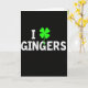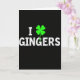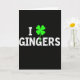Esta tarjeta presenta un fondo negro profundo con un gran mensaje centrado que dice “I ☘️ GINGERS” en letras mayúsculas blancas. La “I” se sitúa a la izquierda, el trébol de cuatro hojas brillante reemplaza a un corazón en el medio y “GINGERS” se extiende hacia la derecha en el mismo tipo fuerte. La letra blanca tiene una textura ligeramente moteada y desgastada que la hace parecer suavemente desgastada en lugar de brillante. El trébol es de un verde eléctrico brillante 💚 con hojas redondeadas y suaves, destacando como el único color contra el negro. Con el trébol actuando como sustituto del afecto, la disposición se siente como una nota de amor descarada o un saludo amistoso. Todo se mantiene simple y centrado, dejando mucho espacio negro abierto alrededor de las palabras para que tus ojos vayan directamente al mensaje. El trébol verde se sitúa entre la “I” blanca y “GINGERS” blanco, brillando intensamente