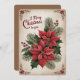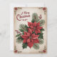 Esta "Tarjeta navideña de Feliz Navidad" es un diseño encantador y elegante que encarna el espíritu de la temporada de Navidades. La tarjeta cuenta con una impresionante pieza central de vibrantes poinsettias rojas, rodeadas de exuberantes hojas y ramas de pino verdes. Las ricas bayas rojas y los delicados acentos blancos en las hojas añaden profundidad y sofisticación al diseño. La frase "Una Feliz Navidad para ustedes" está elegantemente redactada en la parte superior, creando un mensaje cálido e invitante. El fondo de estilo vintage, con un suave tono beige y texturas sutiles, realza el carácter atemporal de la carta. Ideal para enviar deseos de corazón a sus seres queridos, esta tarjeta es perfecta para franquear o regalar durante la temporada de Navidades.