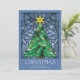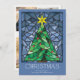 Estas tarjetas de felicitación de Navidades planos de 5" x 7", brillantes y coloridas, presentan un diseño de vidrieras hechas a mano de un árbol de Navidad verde con una estrella dorada y adornos rojos enmarcados en tonos azules sobre un polvoriento fondo azul. El saludo es "Navidades", en grandes cartas decorativas con un saludo editable, "Deseándote paz, amor y alegría esta temporada navideña". La parte posterior de la tarjeta contiene un lugar para tres de tus fotos favoritas con marcadores de posición para tu nombre y año.