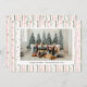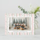 Tarjeta de vacaciones con un bonito fondo de papel pintado rosa pastel y verde con una foto familiar combinada con un saludo navideño y su nombre y año en una fuente sans serif.