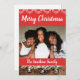Tarjeta de vacaciones para familia afroamericana. Agrega tu propia foto familiar. Hermosa foto y fondo rojo con ramas blancas nevadas y adornos de hielo.