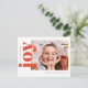 Esta es una tarjeta postal de vacaciones brillante y simple en rojo y blanco que presenta una sola foto minimalista combinada con “alegría” en una fuente serif clásica y elegante en negrita.