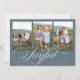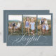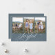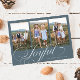 Tarjeta de plantilla de foto navideña minimalista y moderna con 3 fotos y texto con letra que dice "alegre" en la parte inferior. También puedes agregar otra imagen y mensaje en la parte posterior. El fondo es azul pizarra.