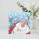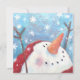 Este muñeco de nieve alegre está celebrando la nieve y la temporada navideña con los palos levantados! Esta imagen es una pintura multimedia original en lona hecha en una tarjeta de vacaciones divertida. La tarjeta plana 5x5 tiene espacio en la parte posterior para escribir un saludo. Vienen con sobres blancos.