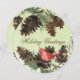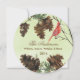 Una hermosa tarjeta de Navidad para enviar a todos tus amigos y familiares, cuenta con una tarjeta redonda con fondo de acuarela verde pálido, conos de pino, ramas de árbol, un cardenal rojo y texto personalizable que dice Felicitaciones Navideñas en la parte delantera, el mismo fondo de acuarela verde, conos de pino, cardenal rojo y ramas con un área personalizable para agregar el nombre de tu familia, nombres y año actual en la parte trasera.